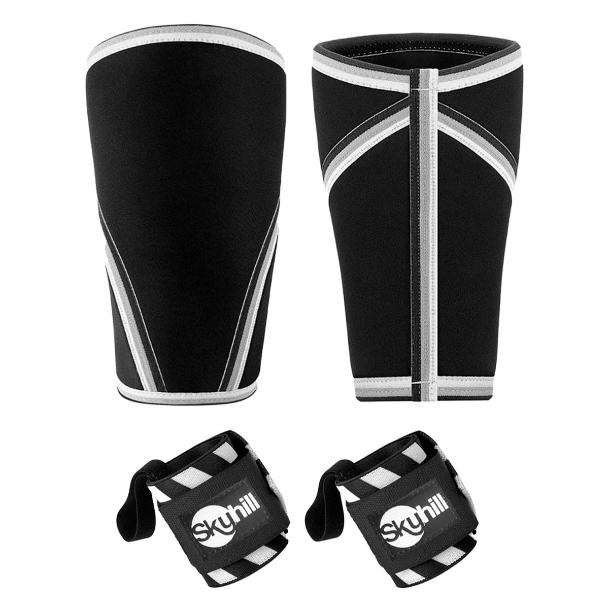 Kit Joelheira Neoprene 7mm Preta e Munhequeira Elástica Listrada Skyhill